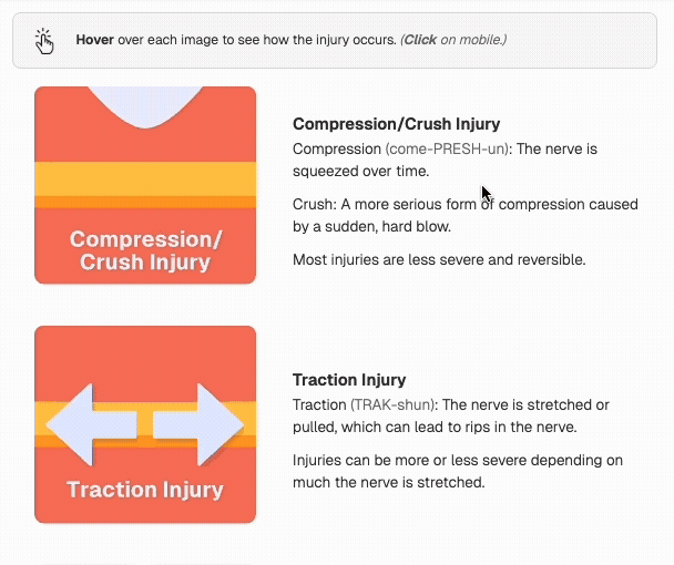The resource features illustrations, interactive elements, and content in plain language to help patients and their families better visualize and understand their injury. This tool is intended to facilitate patient care-provider conversations and serve as a comprehensive resource that patients can revisit at any point in their PNI journey.